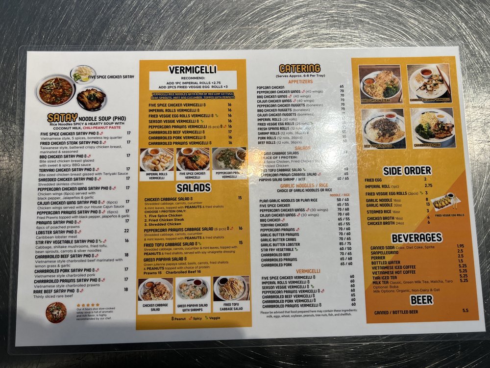 Start your meal with Popcorn Chicken, small boneless bites marinated in a medley of spices, or savor the crispy Peppercorn Chicken Wings, perfectly seasoned for a flavor boost. The entrees shine with Garlic Noodles, rich and buttery, and the aromatic Five Spice Chicken, a fan favorite for its depth of flavor.